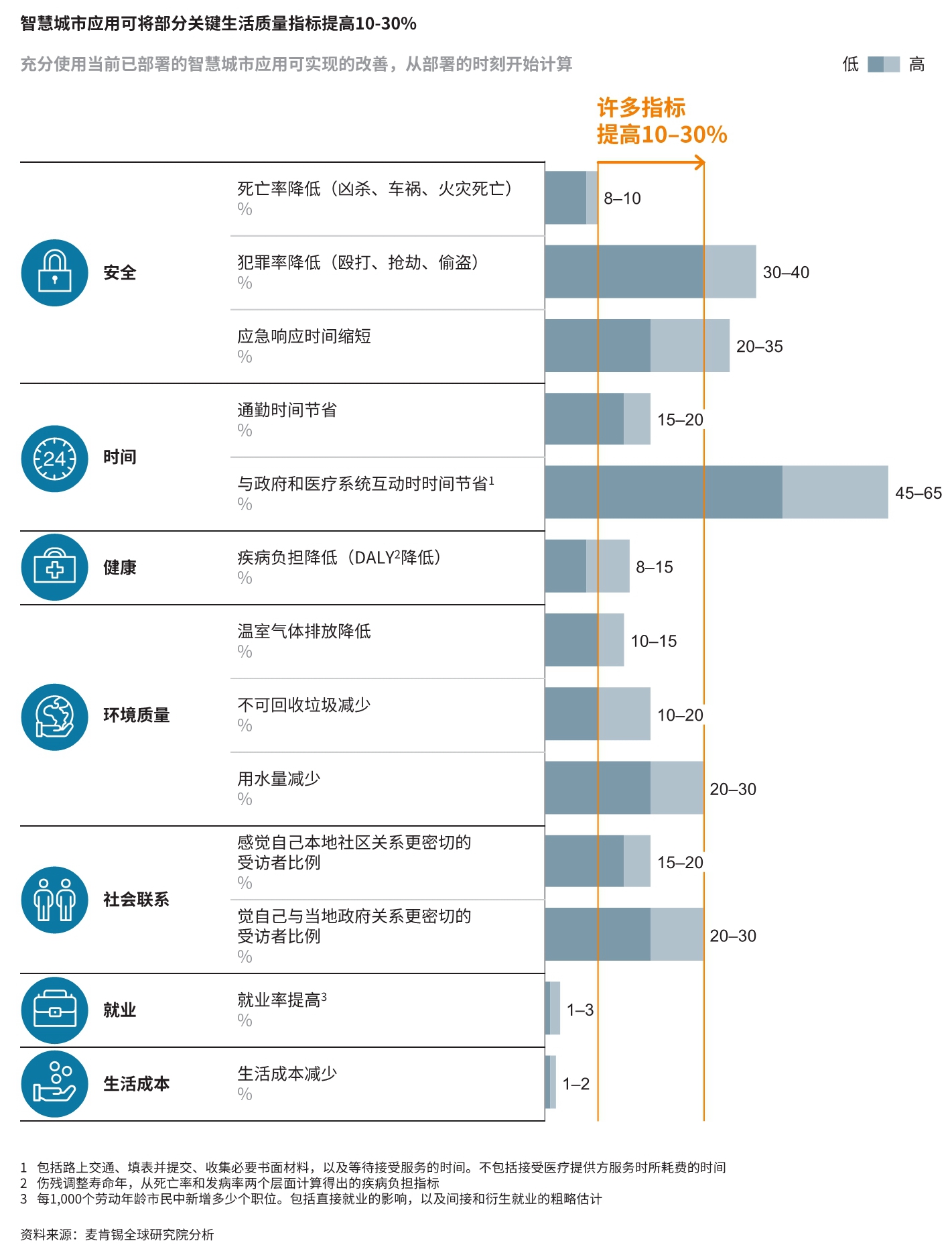 其认为智慧城市应用可将部分关键生活质量指标提高 10-30%,具体包括七个方面: