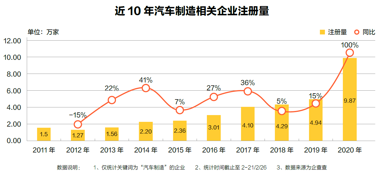 企查查数据显示,2020 年中国新注册车辆制造企业接近10 万家,较19 年几乎翻倍。