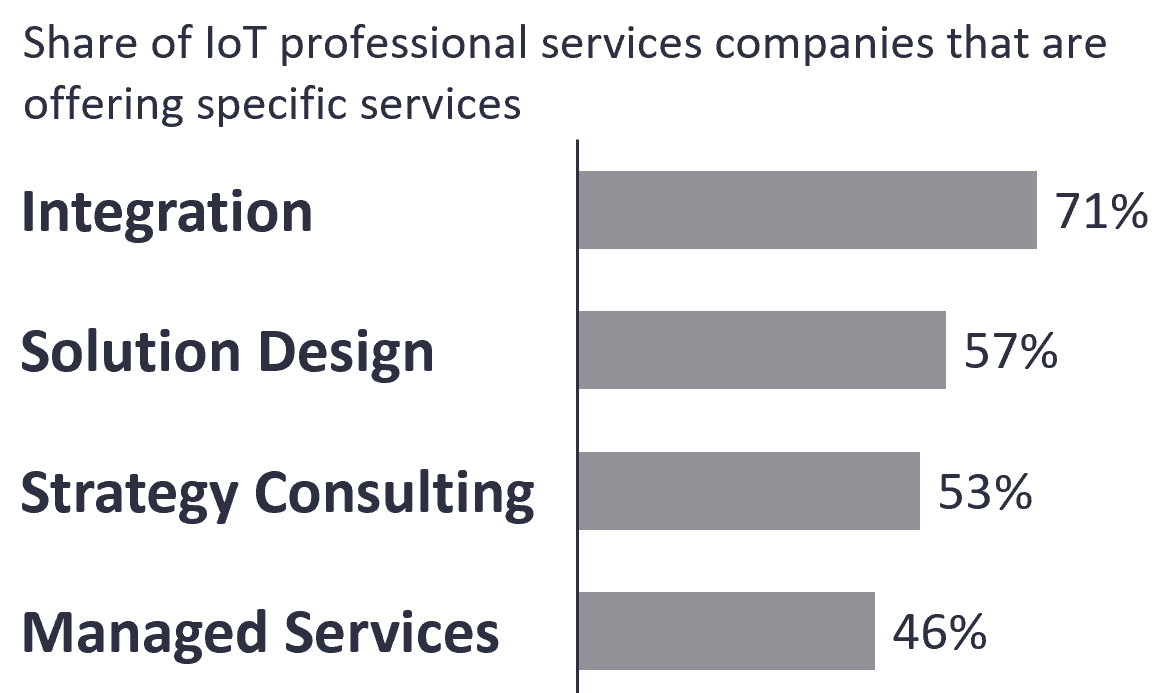 附图是研究机构 IoT Analytics 的定义,其给出了物联网 IoT 项目四个大阶段(业务战略、方案设计、实施和运营维护)的具体细分子服务的构成。