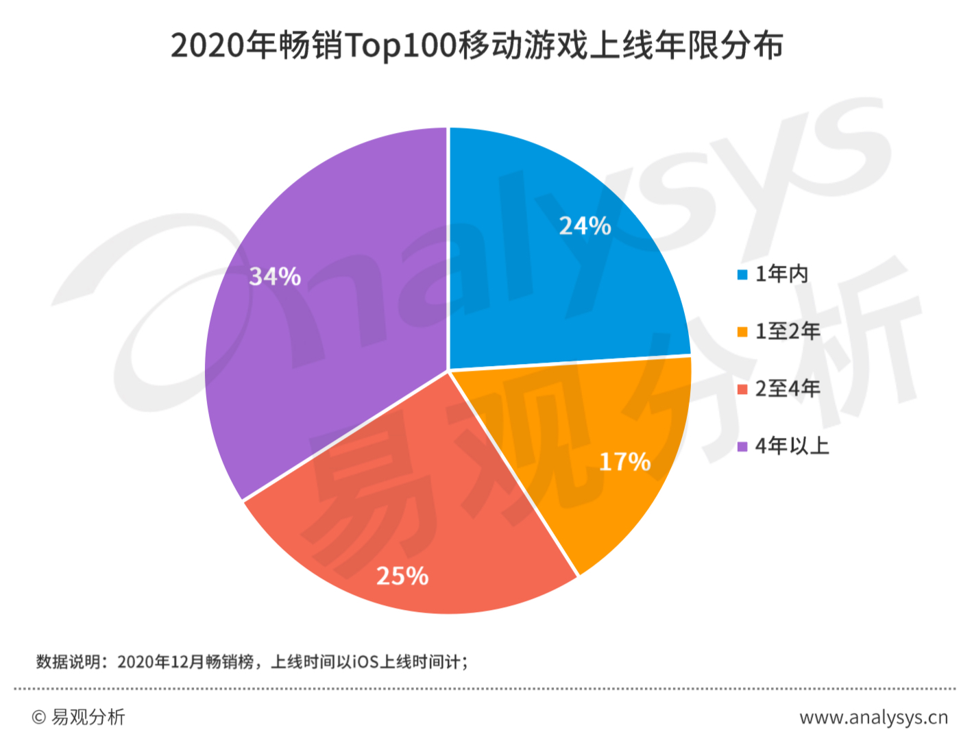 易观分析对中国 Top 100 移动游戏的上线年限进行了统计,34% 的游戏上线运营了四年以上,25% 的游戏运营市场为 2~4 年。一年内新上线的游戏只占 24%。