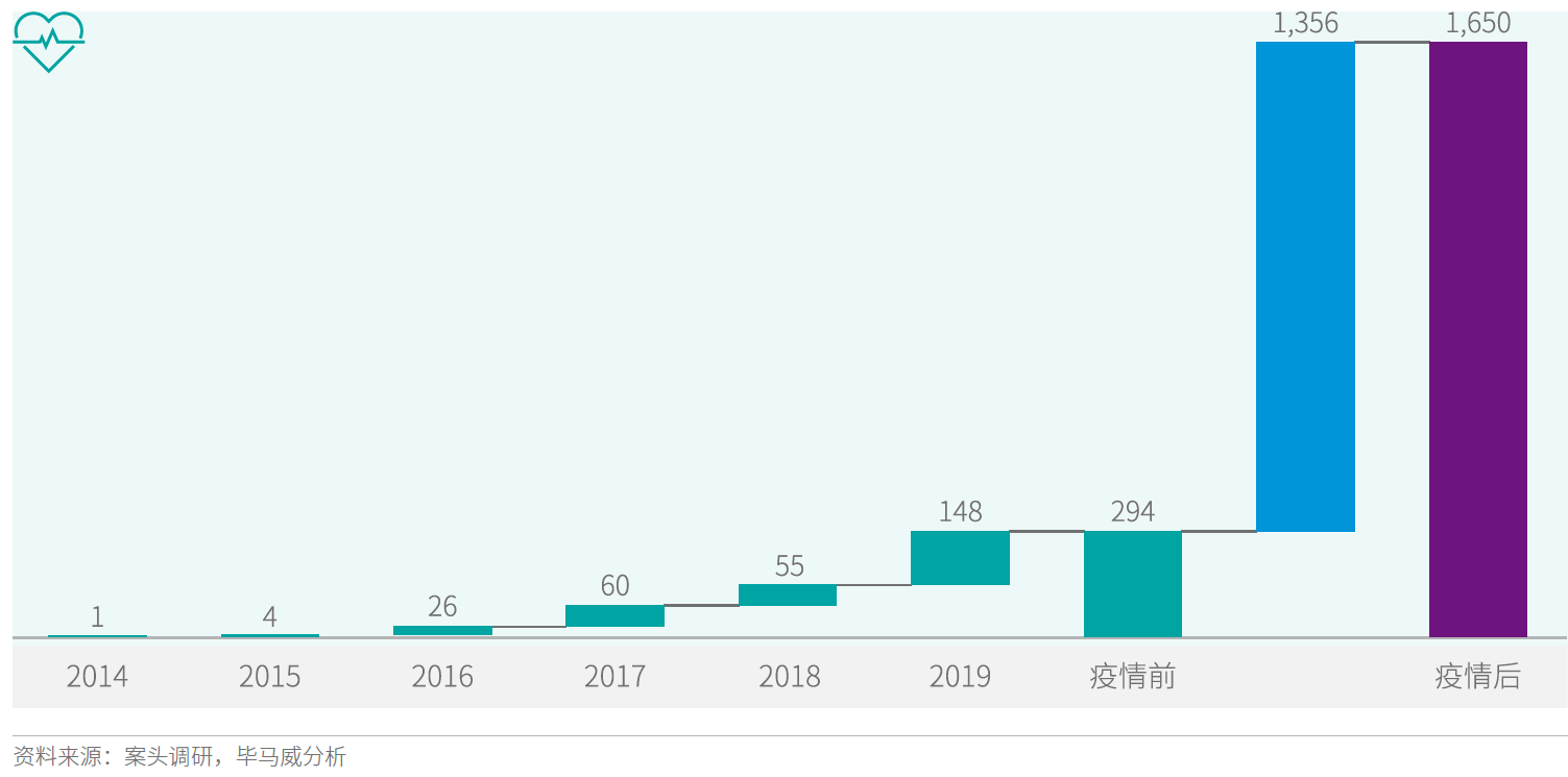 卫生主管部门对线上开展医疗服务是有相关的资质要求的。根据 KPMG 的分析,在疫情开始之前中国有 294 家互联网医院,截止到目前这个数量急速增加到 1,650 家,增长达到了 6 倍。