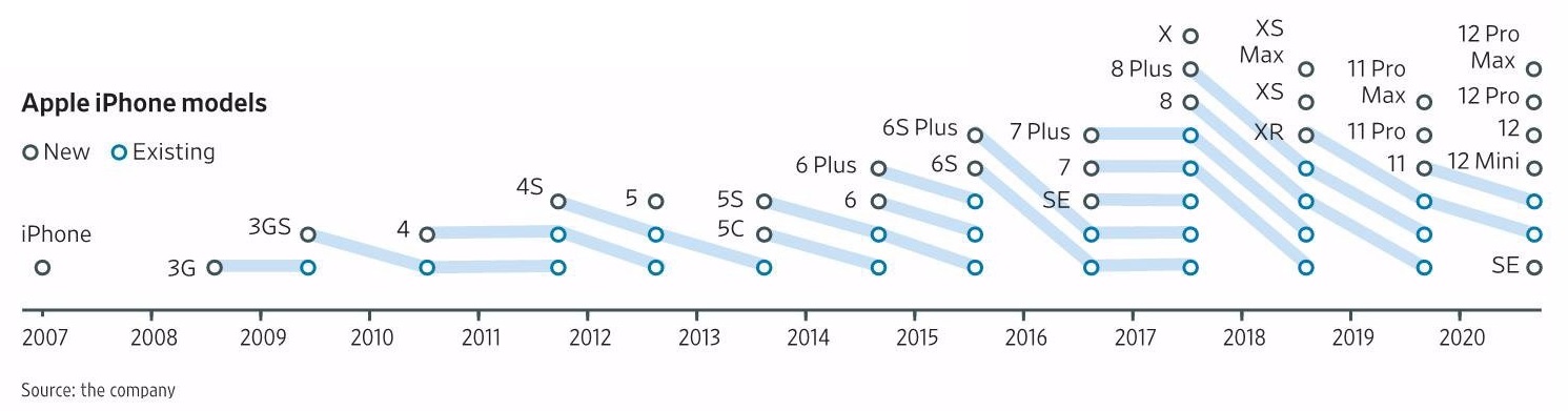 通过把上一年的旧型号降价销售,苹果公司实际销售的手机为两到三个型号。这一策略一直延续到 2014 年之前,距离首款 iPhone 上市长达七年之久。