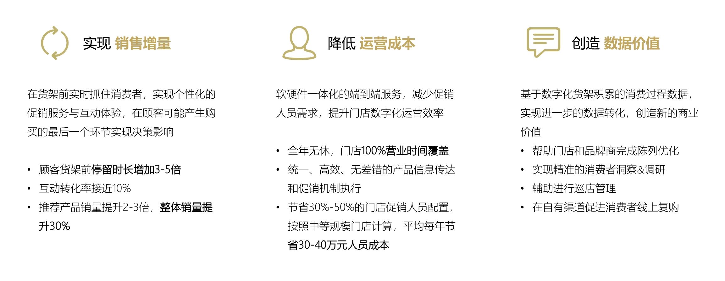 现网案例表明,顾客货架前停留时长增加 3~5 倍,互动转化率接近 10%,推荐产品销量提升 2~3倍,整体销量提升 30%。
