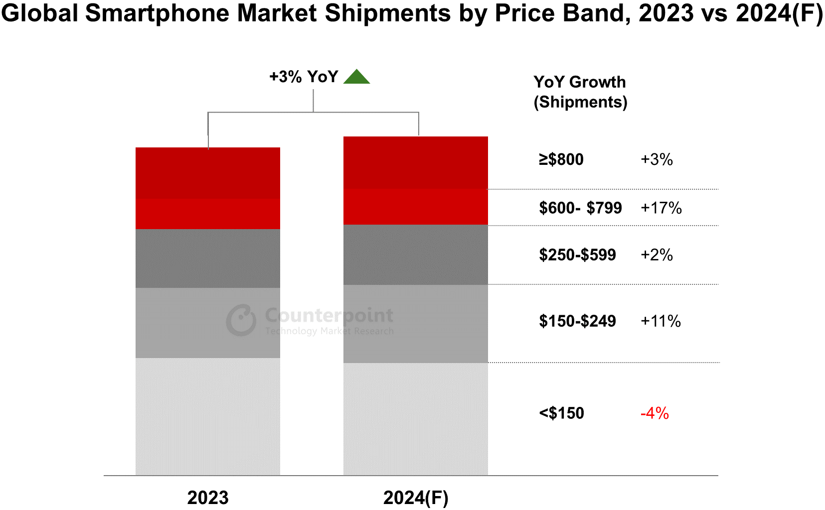 Canalys 数据显示,全球智能手机在 2024Q1 的出货量同比提升了 11%,重新进入了上升通道。