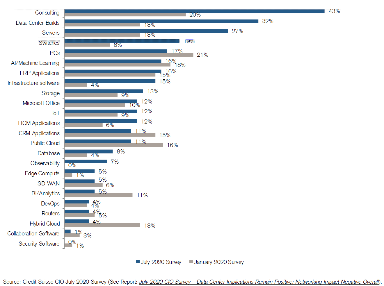 投资银行 Credit Suisse 分别在 2020年1月和7月针对 75 家全球性企业的 CIO(收入大于 10 亿美元)的一项调研中,问及未来三年内最有可能削减成本在哪些领域 ?