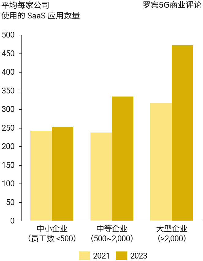虽然整体都在上升,但大型企业(员工数大于 2000 人)的强度明显不同。2021 年大型企业平均使用 SaaS 的数量为是 317 项,2023 年攀升到 473 项。