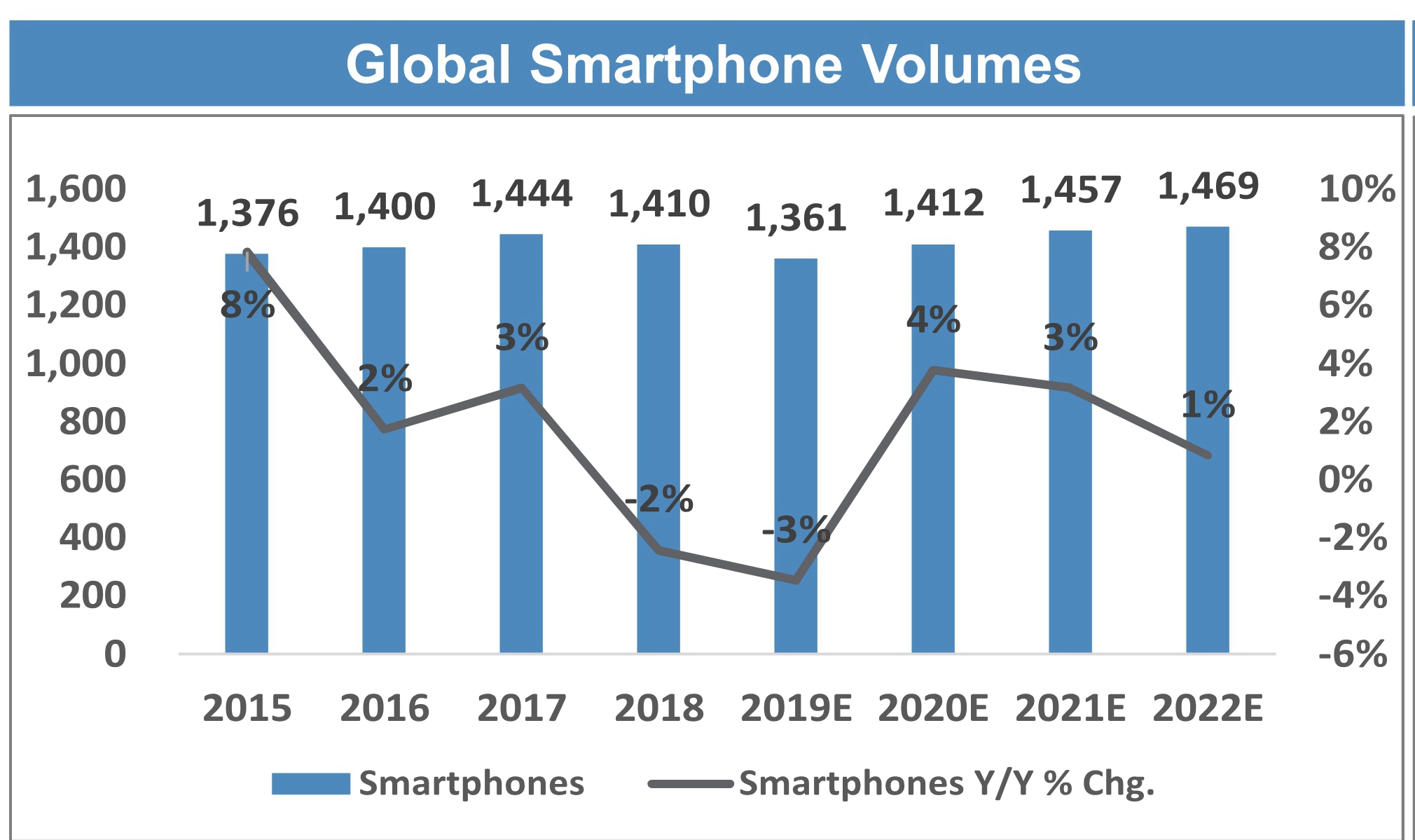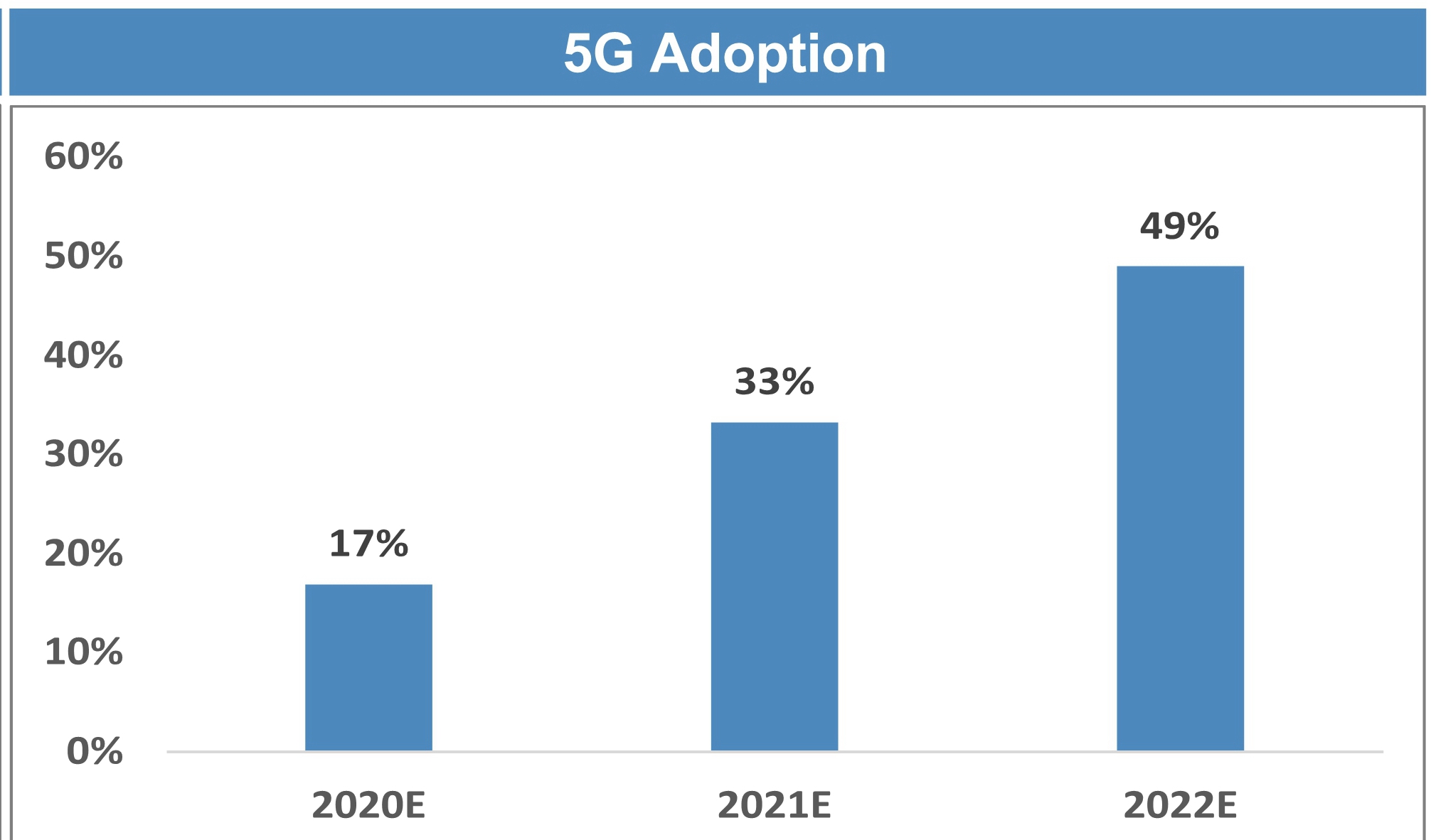 支持 5G 的智能手机占比正在迅速攀升。根据瑞士信贷(Credit Suisse)的估计, 2022 年 5G 手机出货量可达 7.06 亿部。