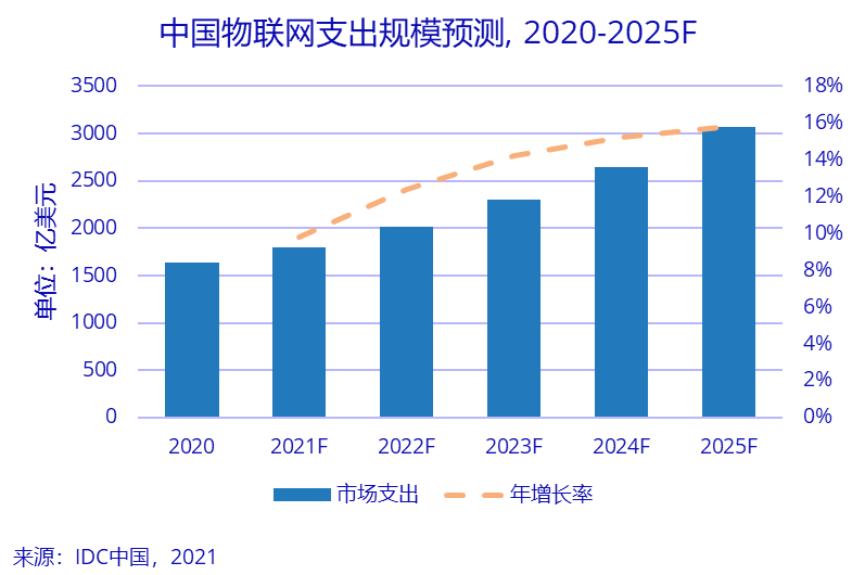 预计到 2025年,中国物联网支出规模将达到 3069.8亿美元,未来五年复合增长率在 13.4% 左右。
