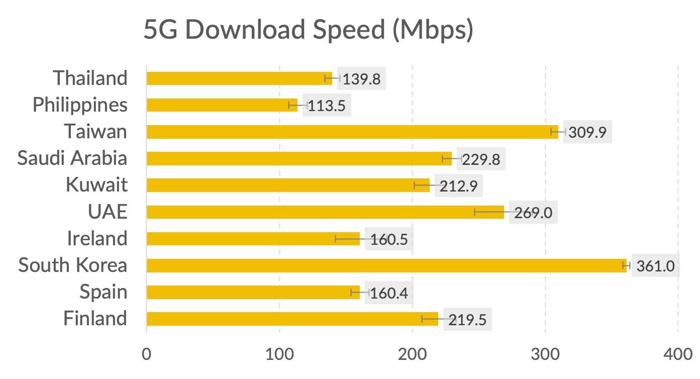 Opensignal 针对国际市场多个 5G 商用国家和地区的现网用户进行体验测量,此处数据取自 2021年一季度。