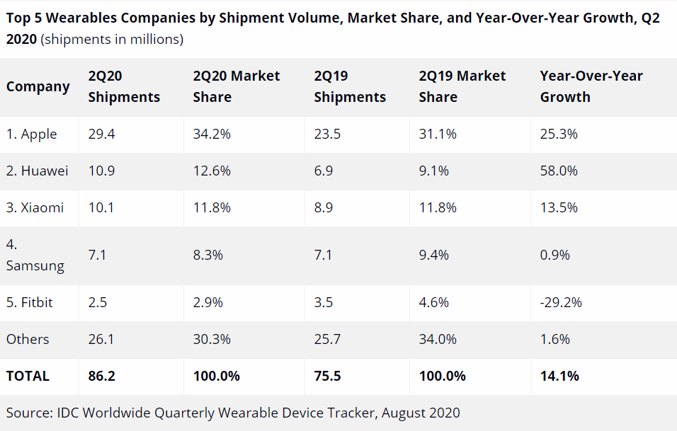 根据 IDC 的数据,2020Q2 全球可穿戴设备出货量增长为 14.1%,达到了 8620 万部。