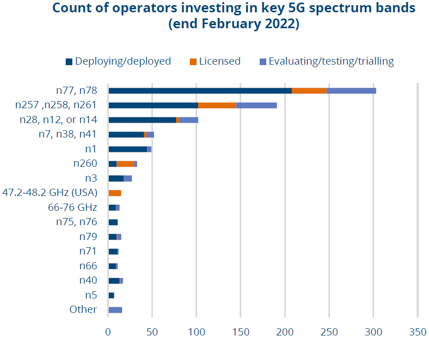 根据 GSA 的统计,从获得频率分布看,支持 n77(3.7GHz),n78(3.5GHz)的运营商最多,达到了 300 家。