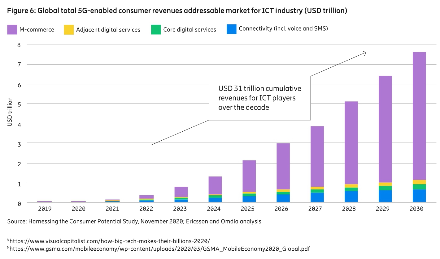 预计到 2030 年,5G 使能的消费者业务(5G-enabled consumer addressable market)将接近 8 万亿美元/年。