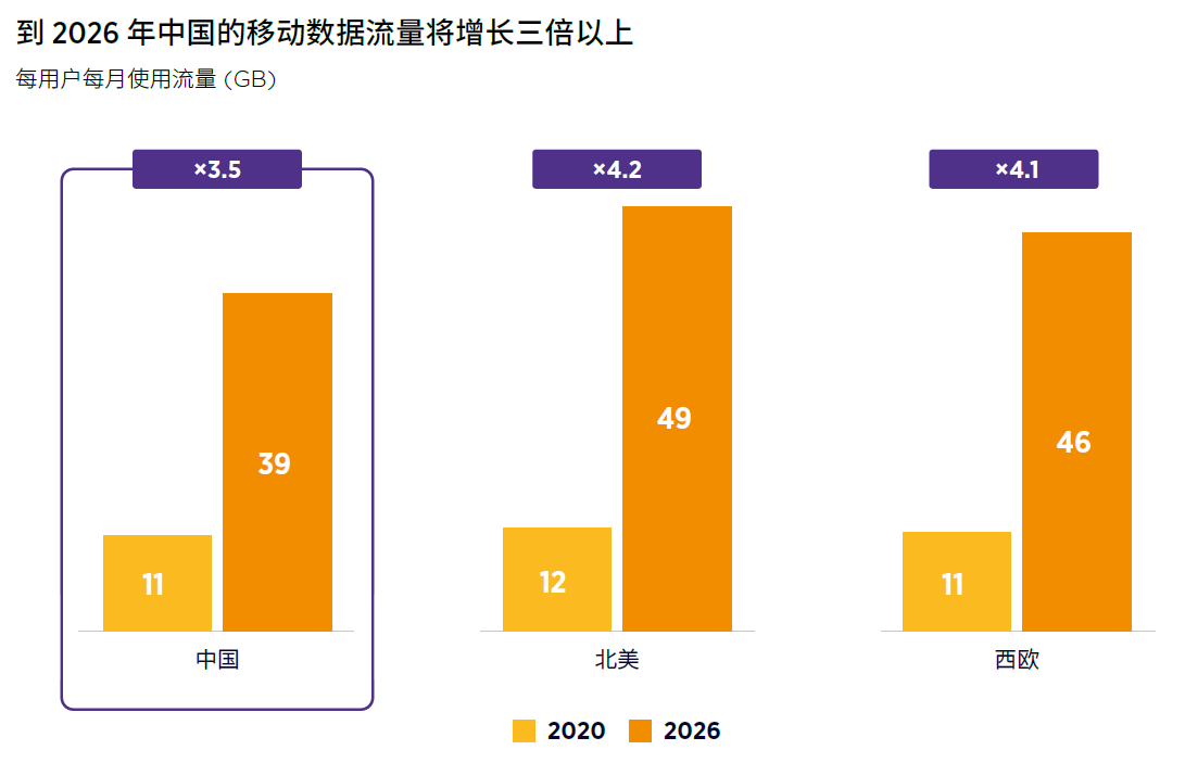 其中,中国会增长 3.5x 达到 39 GB/月,北美地区可达到 49 GB/月,西欧 46 GB/月。