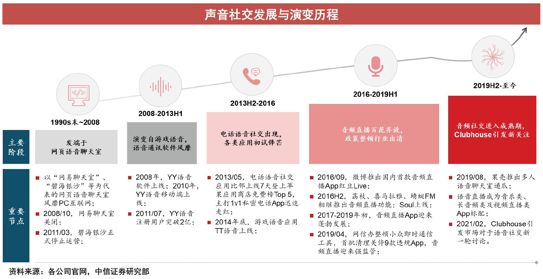 近年来的播客(Podcast)、听书和故事的电台等日趋成为主流形式。2021 年初爆红的 Clubhouse 又掀起音频社交的高潮。