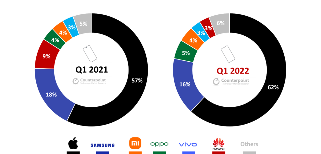 来自 Counterpoint 的数据监测,单价 400 美金及以上的高端手机(Premium)在 2022Q1 同比去年出货量下跌了 8%。但 Apple 的份额却从去年的 57% 提升到 62%。