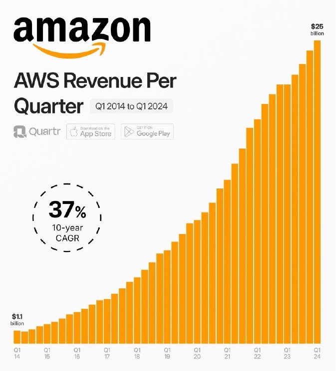 Amazon 自 2006 年开始公有云服务 AWS,2013 年左右开始独立披露财务数字,持续多年保持 40~60% 的年增长率,2019 创造了 350 亿美金收入和 92 亿美金的运营利润。