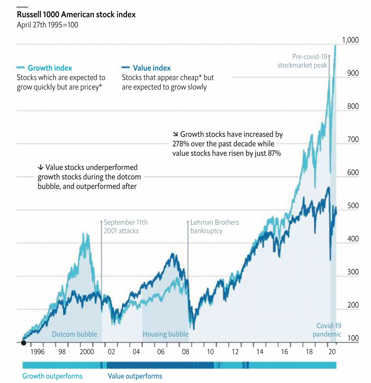 经济学人绘制了 1995 至今的罗素 1000 美国股值指数,并标识出三次标志性“行情”:⑴ DotCom 泡沫;⑵ 住房泡沫;⑶ 新冠疫情。