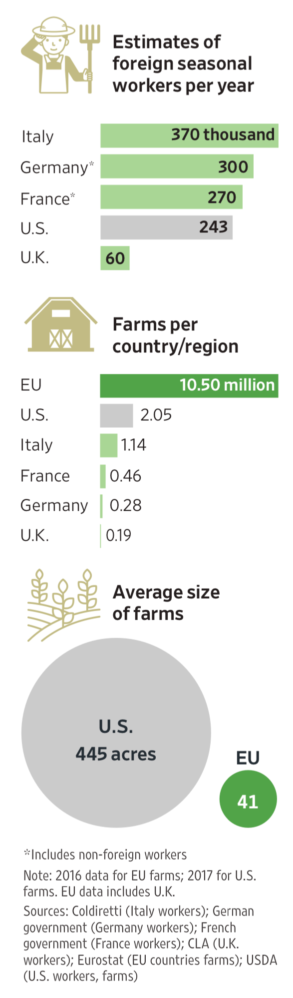 WSJ 发布了欧盟和美国农业的外来用工和作业面积的数据,关注智慧农业及 IoT 的朋友可留意。