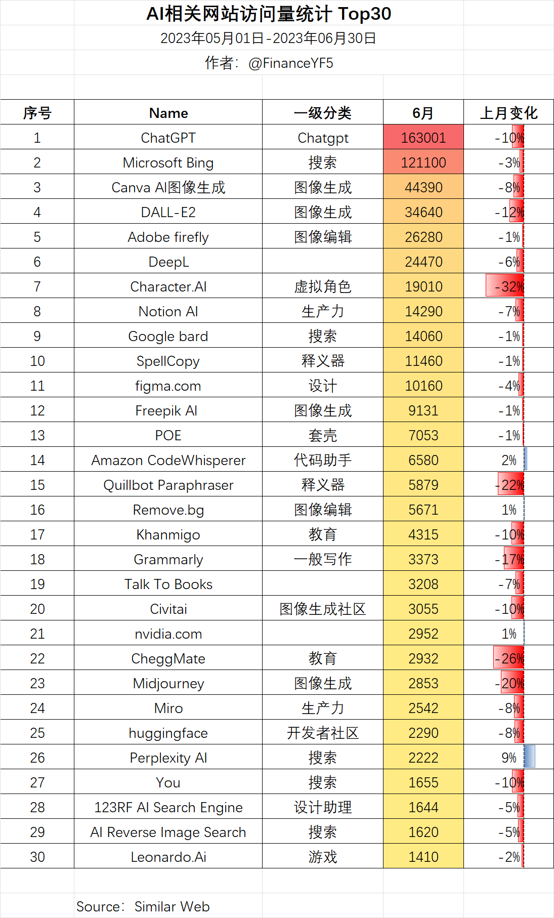 从 Similarweb 跟踪的数据看,ChatGPT 的阅读访问流量已开始下滑。