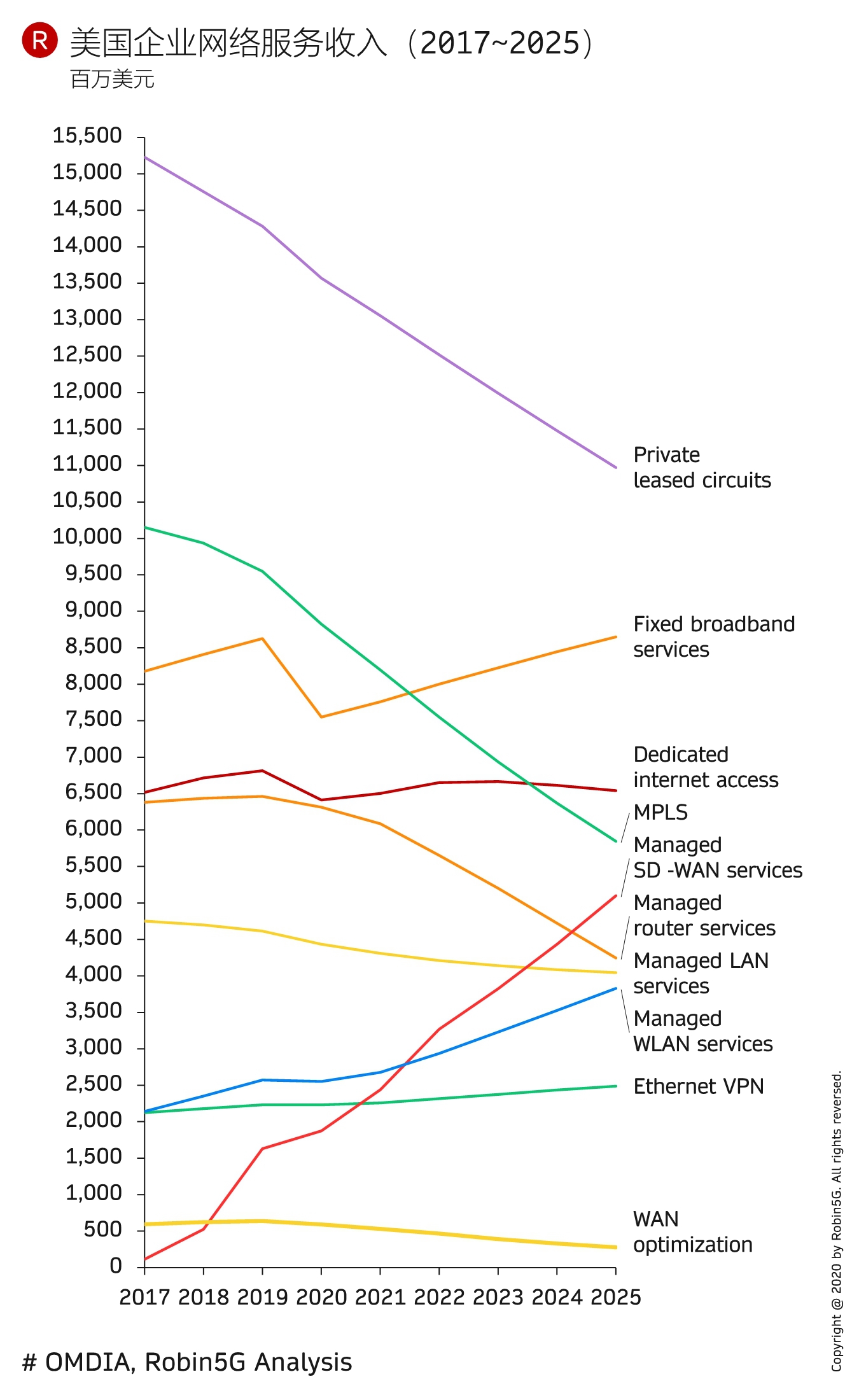 #国际市场# 美国企业网络服务各细分方向的收入空间(2017-2025)