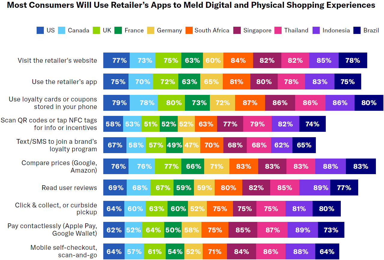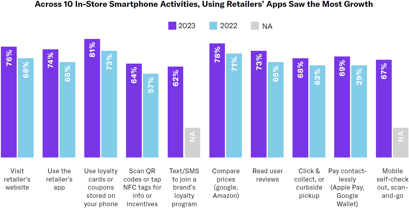 Airship 针对北美、西欧、东南亚和巴西的消费者调查显示,对比 2022 年,消费者在零售品牌商的门店内使用智能手机的活动大幅增加。