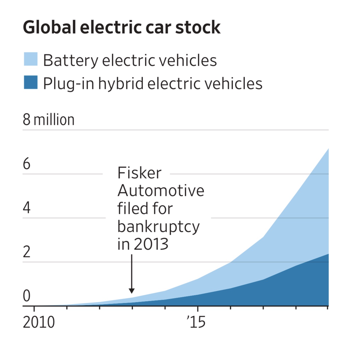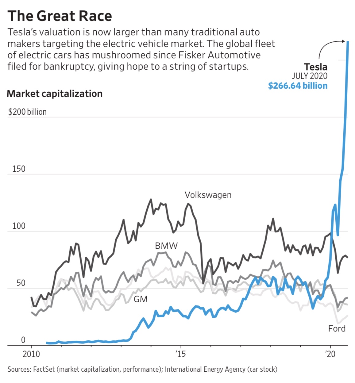 图一是 2010 年至今,全球纯电动汽车与混合动力汽车的销量;图二是大众、宝马、通用汽车、福特四大车企与特斯拉的市值对比。