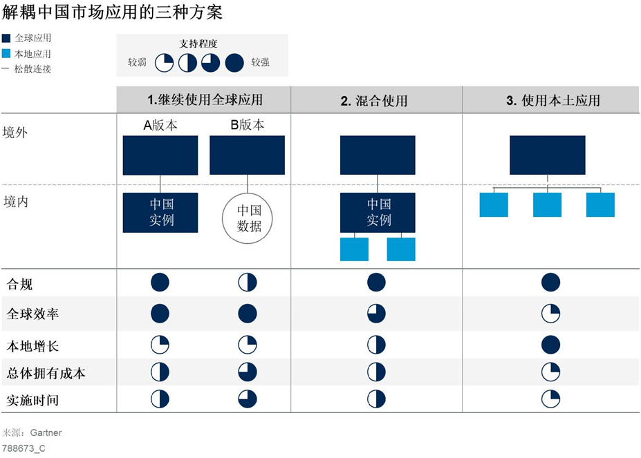 图二是 Gartner 给出的三种方案:(1) 使用全球应用; (2) 混合使用;(3) 使用本土应用。由于应用的复杂性(大型企业很多都有上千款应用),而每类应用面临的监管要求是不同的(比如:如果涉及本土用户数据,要求数据不离境等)。同一家跨国企业,更可能也是有多种组合。