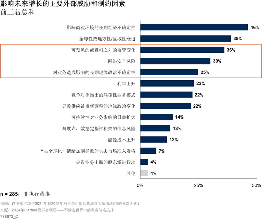 Gartner 针对全球性跨国企业的调研显示,影响未来增长的外部威胁和制约因素中,经济环境的不确定性、全球性或区域性衰退是排名前两位的因素。监管、网络安全和地缘政治风险位列风险的第 3-5 位。