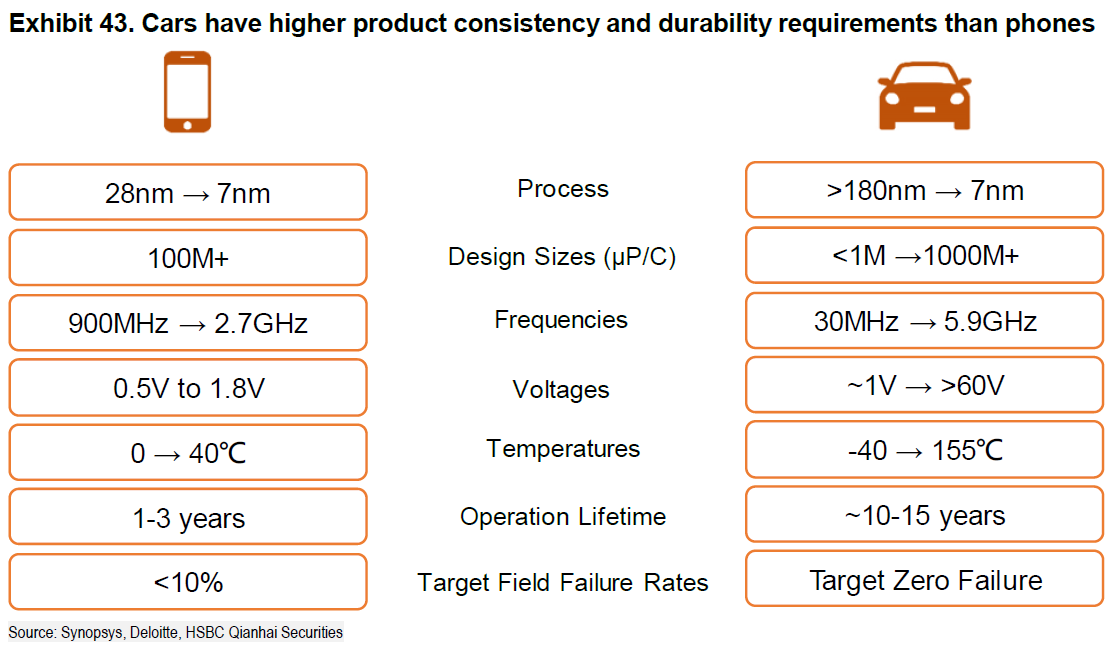 附件是 Synopsys 的研究,对比了智能手机和汽车用芯片的指标差别。