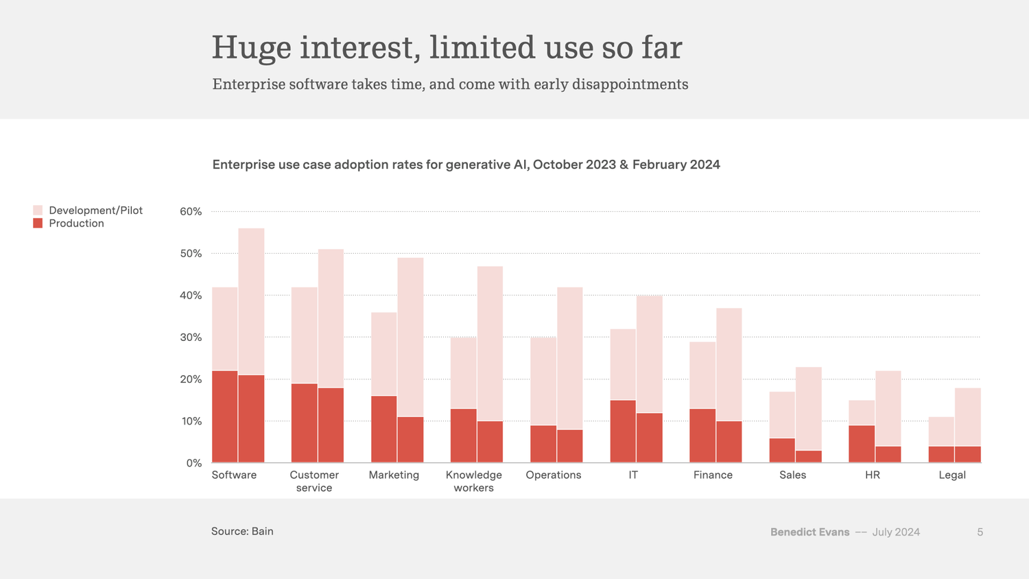 生成式 AI 工具在内容营销相关领域已经得到了规模应用。附图来自 WordPress 企业客户的调研,Top 5 工具分别为:(1) ChatGPT、(2) Chatfuel;(3) Brand24;(4) DALL-E;(5) HubSpot SEO。