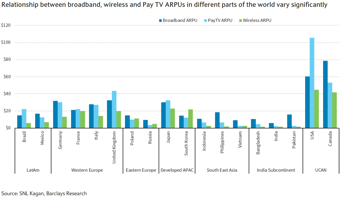 (1) 美国:媒体很强,内容很值钱,付费电视的 ARPU 大幅高于固定宽带,固定宽带又高于移动业务;