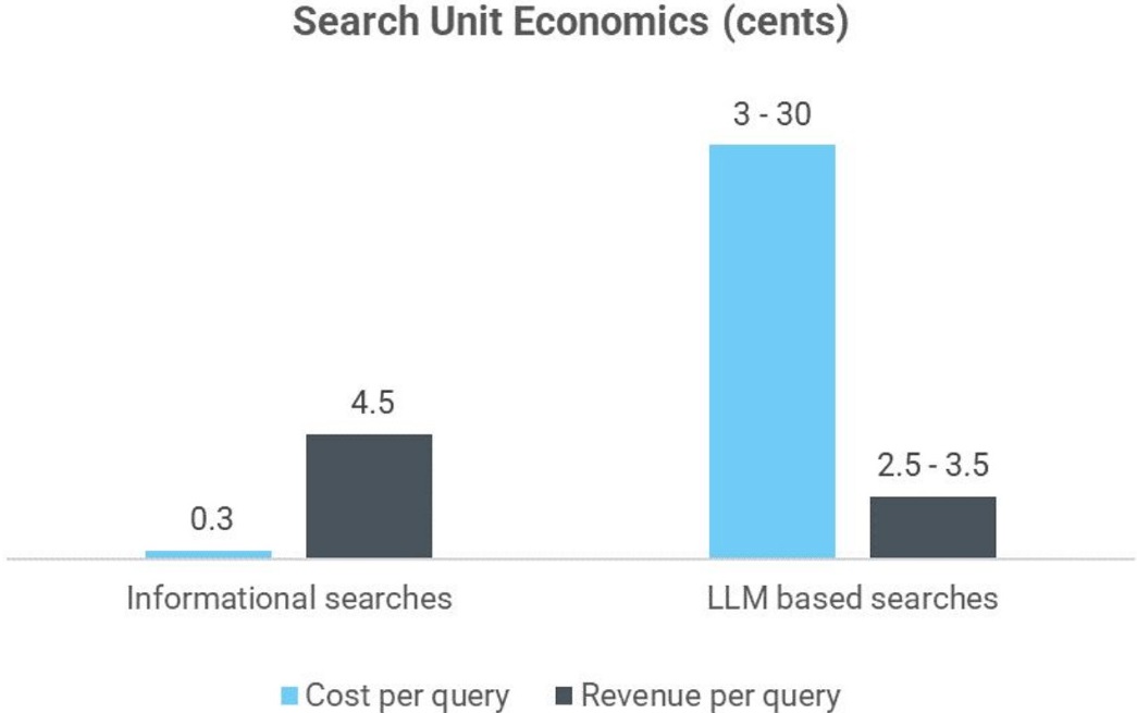 Altimeter 的研究认为,以每次搜索查询为例,传统查询每次的成本为 0.3 美分,而大模型搜索的查询成本为每次 3 - 30 美分。查询带来的商业变现角度,传统查询每次可带来 4.5 美分的收入(主要是广告),而大模型搜索带来的收入为每次 2.5~3.5 美分。