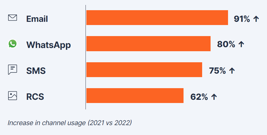 具体方面,WhatsApp 在银行和金融领域的使用量大增了 134%,Email 在零售和电子商务上提升了 155%,RCS 在电信行业也要很大增幅(基数相对小),Facebook Messenger 在交流物理领域的消息量增加了 428%。