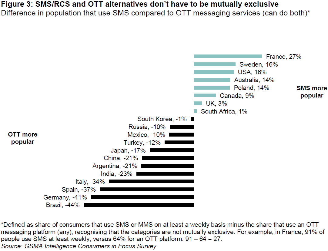 附图是 GSMA 在主要国家和地区的一项调研,围绕 SMS/RCS 和 OTT 消息的对比。结论是两者会共存,不会是互斥关系。