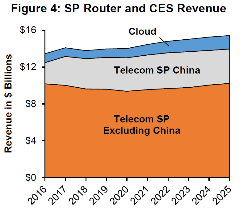 阅读到一张数据,来自研究公司 Dell'Oro Group,关于全球 SP Router(运营商级的大型路由器)和 CES(Carrier Ethernet Switch 运营商级以太网交换机)的收入空间。