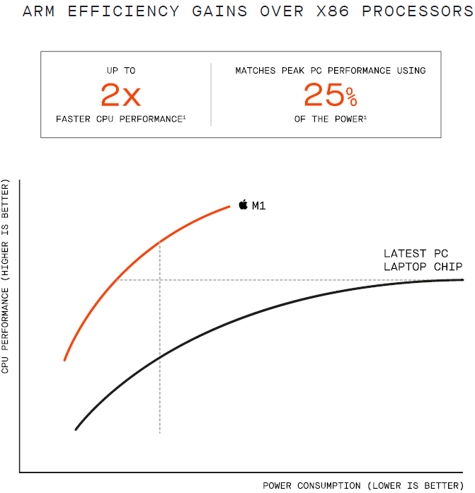 M1 是基于 ARM 指令集开发,继承了 ARM 能耗方面的优势。技术型投资银行 GP Bullhound 认为同等能耗情况下,Apple M1 芯片的性能是 x86 处理器的两倍。