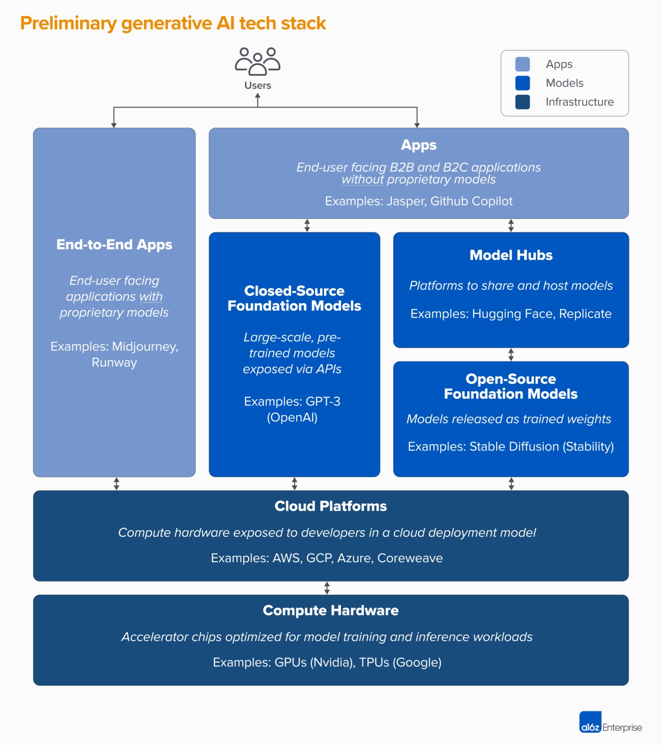 风险投资机构 a16z 描绘了生成式 AI(AGI)的技术栈层次。最底下两层是计算机硬件(服务器、GPU 等)和云平台(AWS、Google 云、Azure 等);