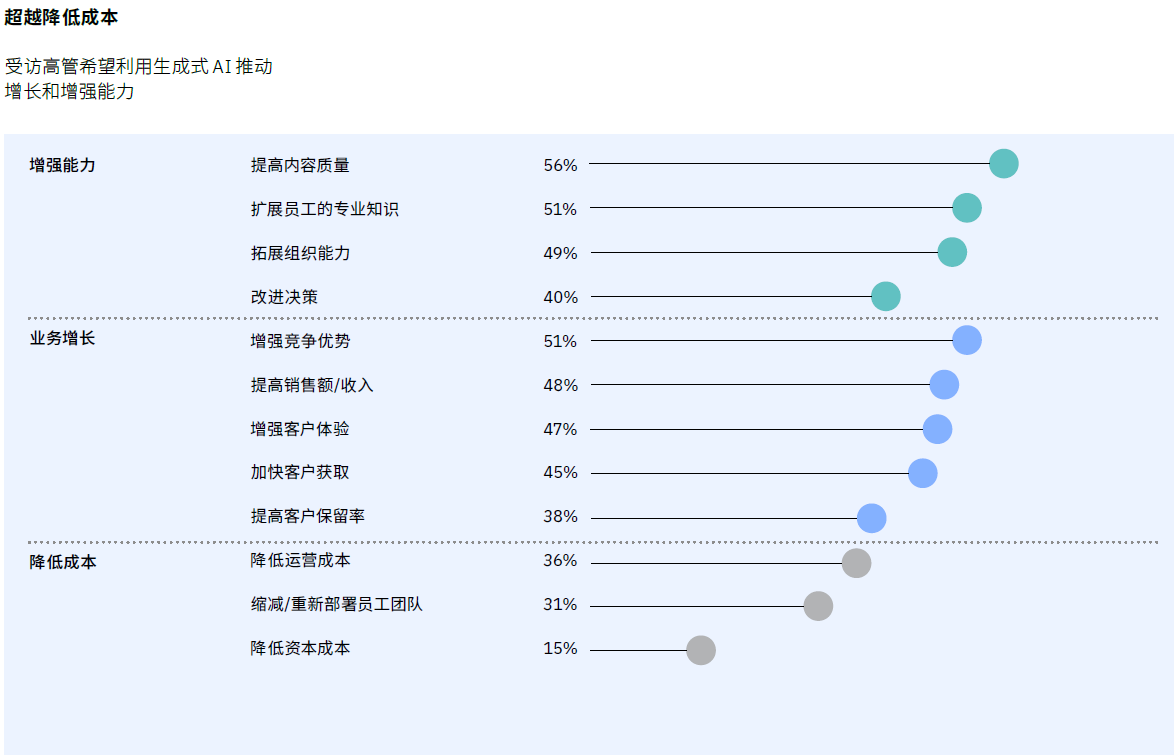 围绕生成式 AI 的价值,受访高管更关注通过增强体验来扩展能力和推动增长,而不是通过 AI 去代替人力等来降低成本。