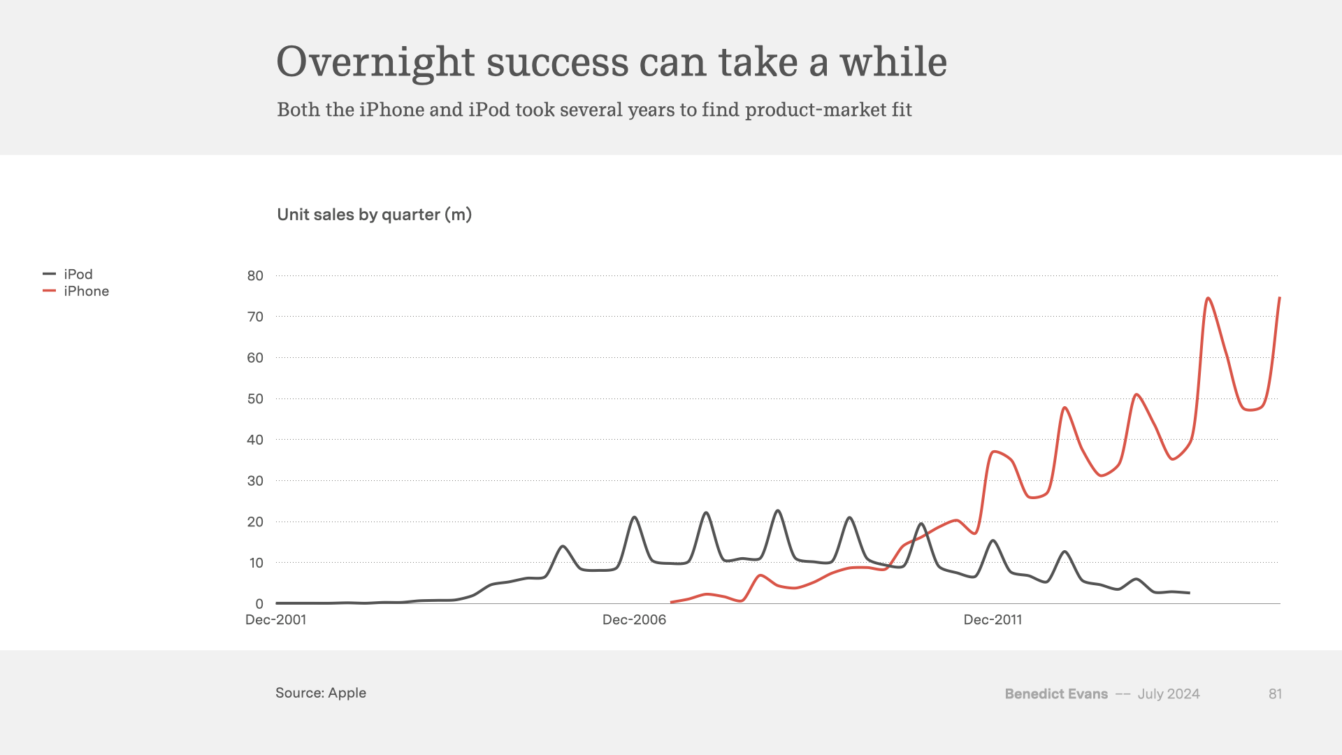 Benedict Evans 提及了一个观点,即便是 iPhone 前 12 个月只售出了 540 万部,直到 2010 年以后,才开始大规模销售提速。