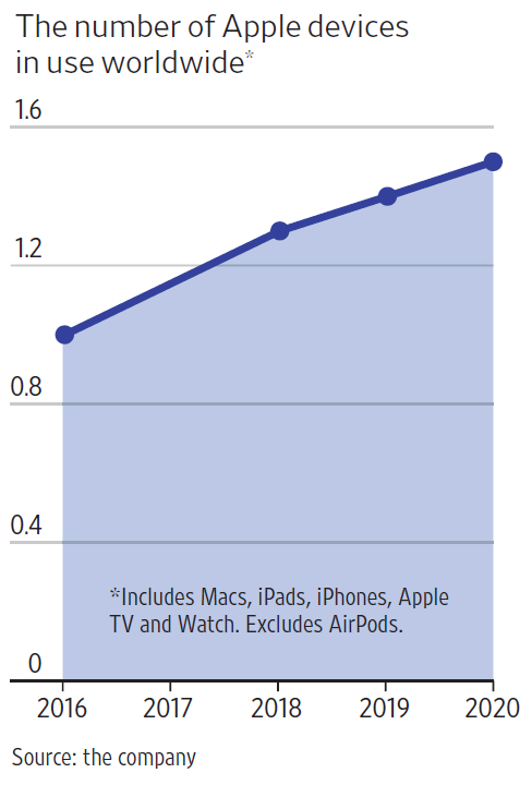 图 1 代表 Apple 的存量客户:正在使用的终端(Mac、iPhone、iPad、Apple TV、Watch)目前达到了 15 亿部。
