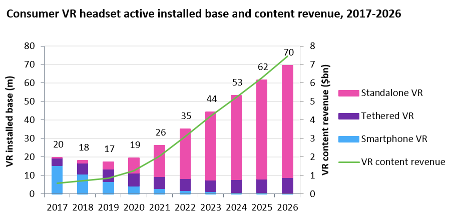 OMDIA 预计 2026 年全球将有 7000 万消费者 VR 用户。这些用户每年在游戏或其他媒体内容上的开支将超过 75 亿美元。