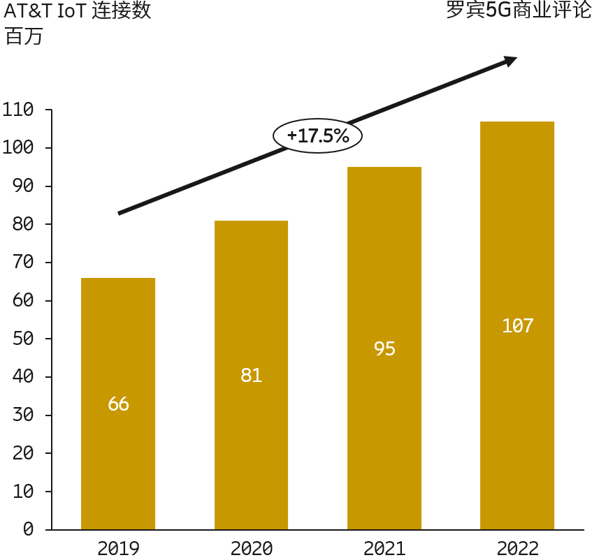 AT&T 的物联网 IoT 连接业务在过去四年保持了 17.5% 的年复合增长率,2022 年底 IoT 连接总数达到了 1.07 亿。
