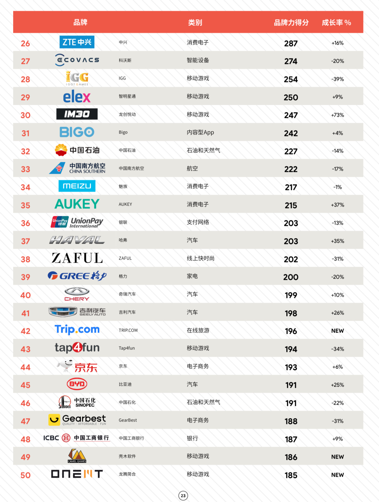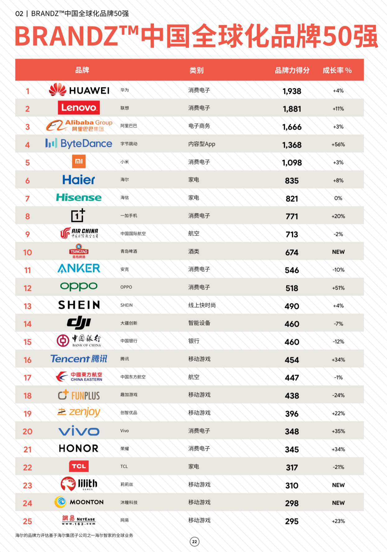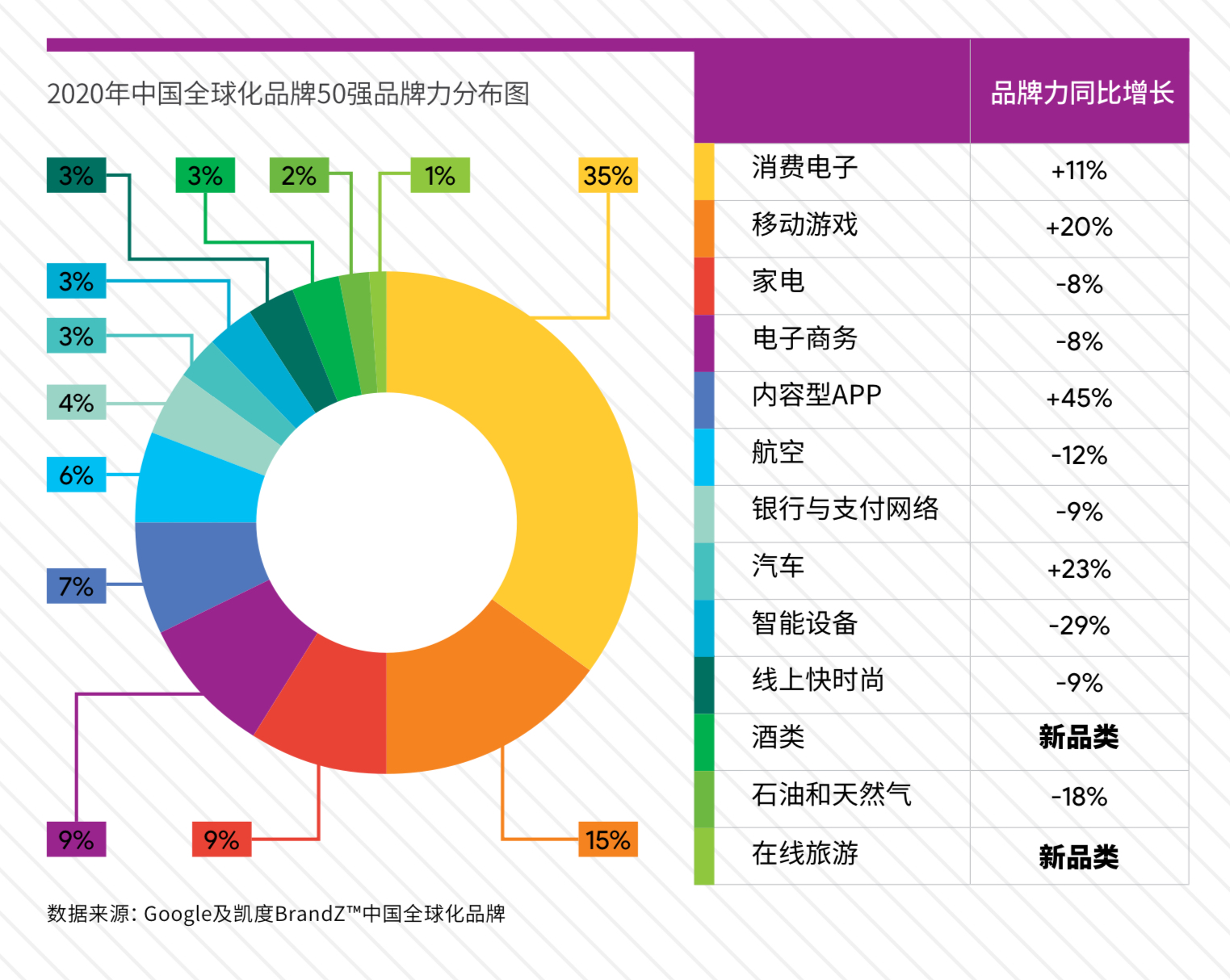 WPP 凯度联合Google 发布了中国企业全球化品牌的 Top 50。消费电子、移动游戏、家电、电子商务和内容型 App 位居前五名。