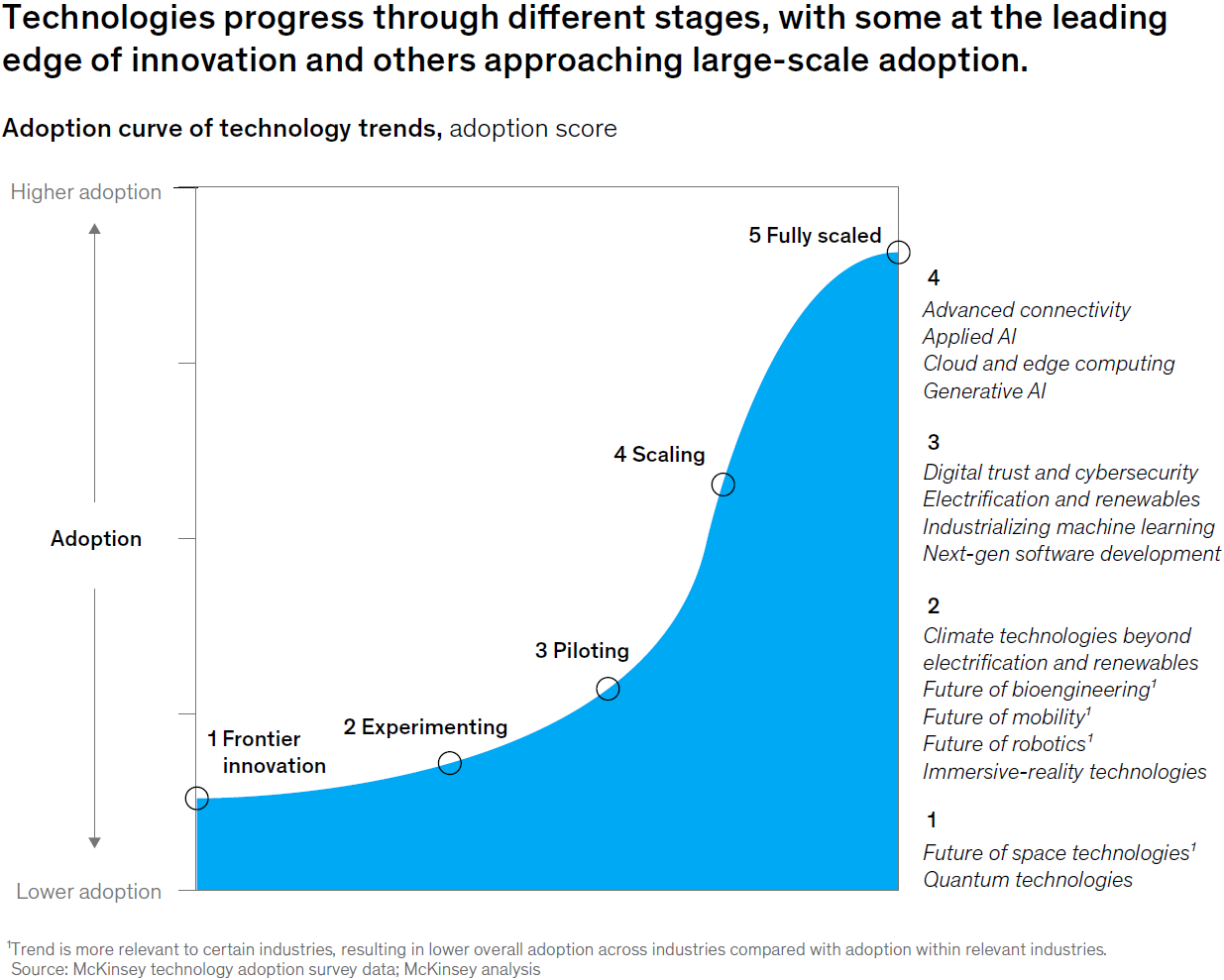 附图来自 Mckinsey 2024 版的技术展望,其对代表性新技术的应用状态进行了评价。