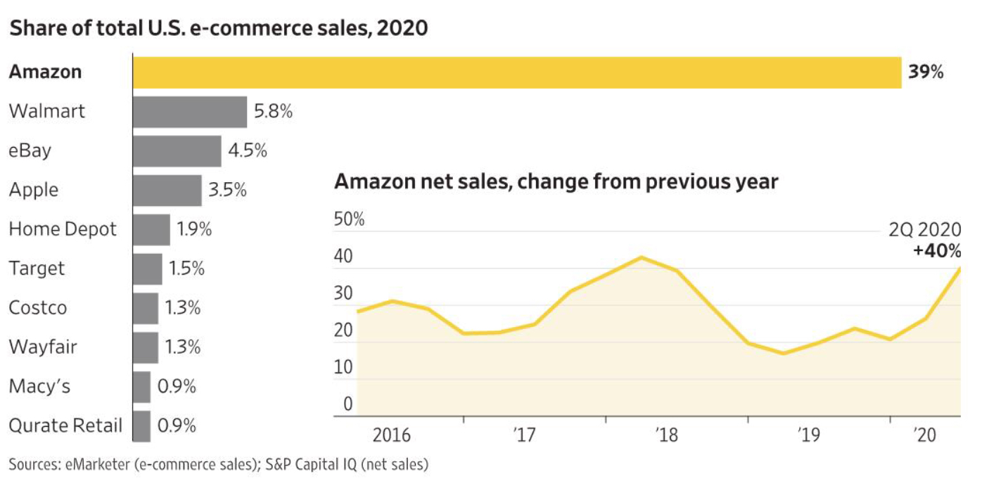 以美国电子商务今年的排名看,Amazon 拿走了近四成。沃尔玛、eBay 以 5% 左右的份额为例二三名。