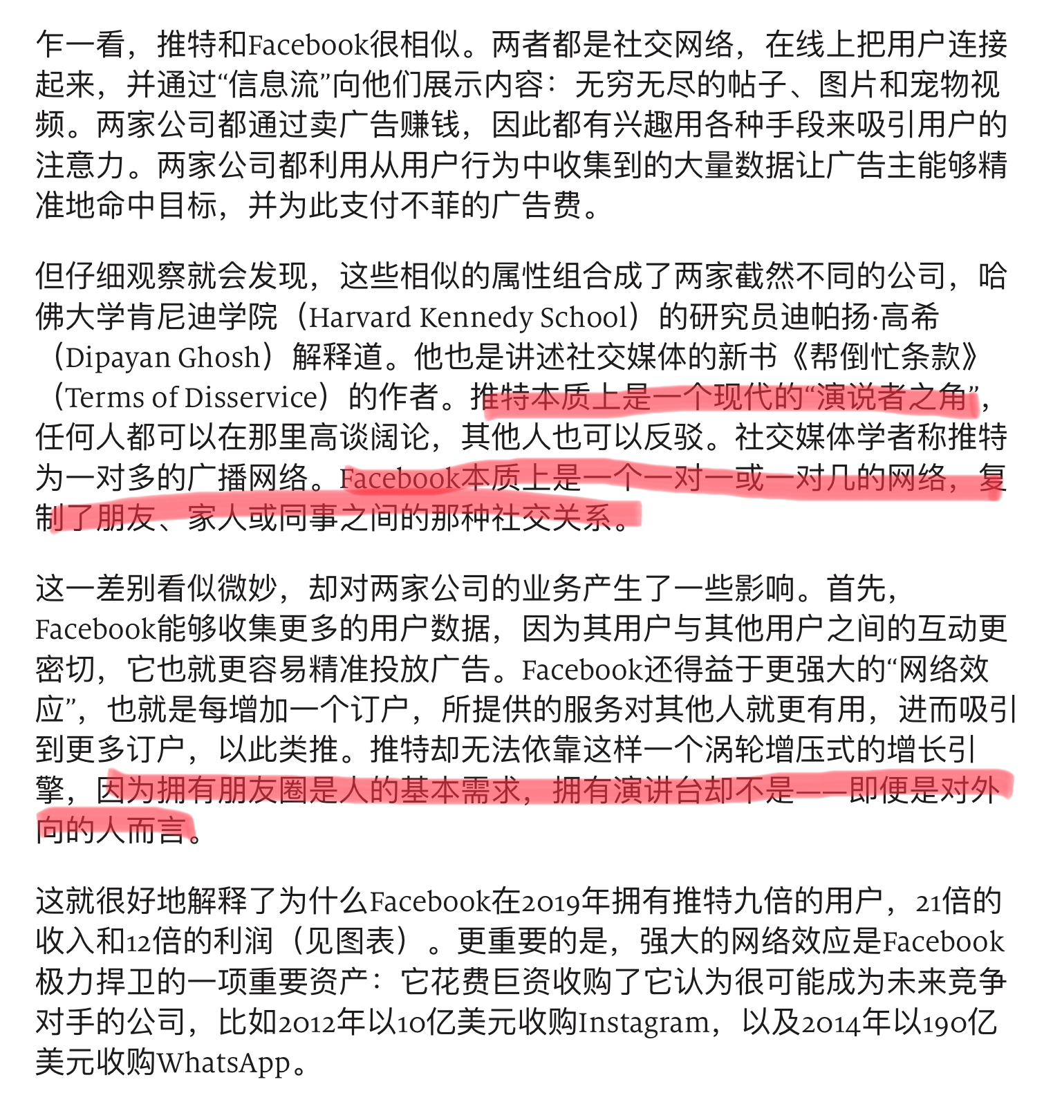 - Facebook 本质是一对一或一对几的网络,复制了现实中朋友、家人或同事之间的那种社交关系;