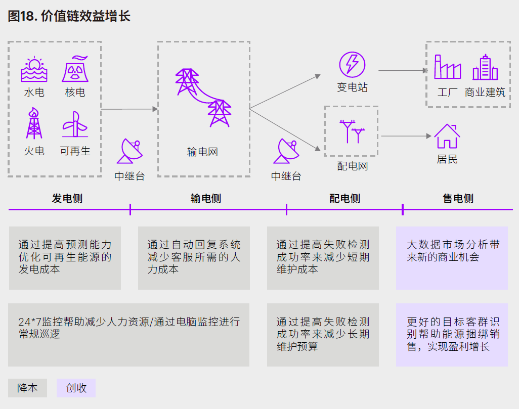 附图是 Accenture 给出的关西电力价值链效益增长的构成。灰色环节为降本,紫色环节为创收。