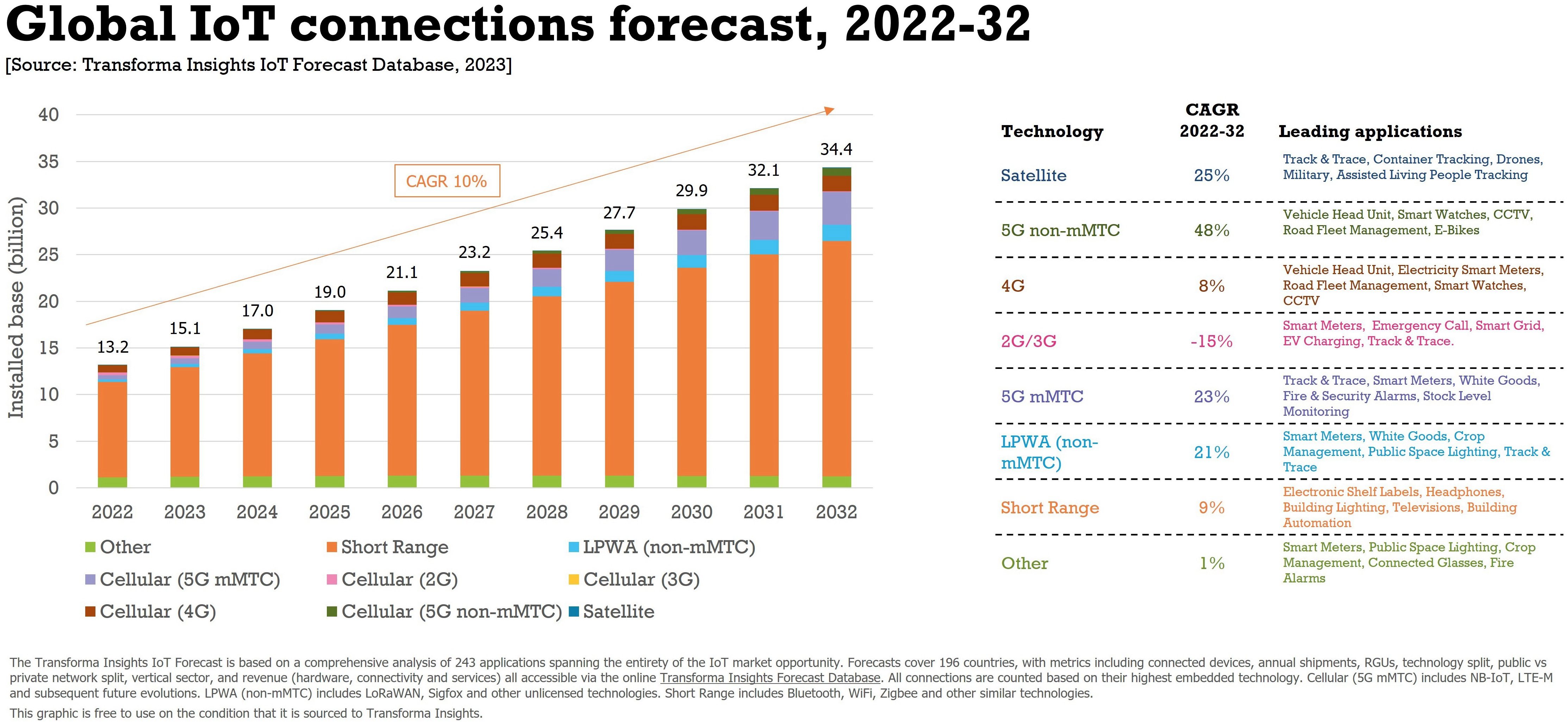 研究机构 Transforma Insights 数据显示,到 2032 年,全球广义物联网(各种常见制式都包含,不限于蜂窝移动网络)连接数可达 344 亿。