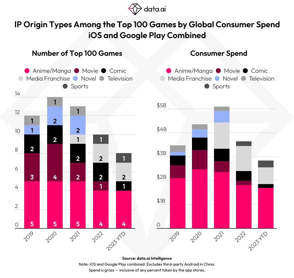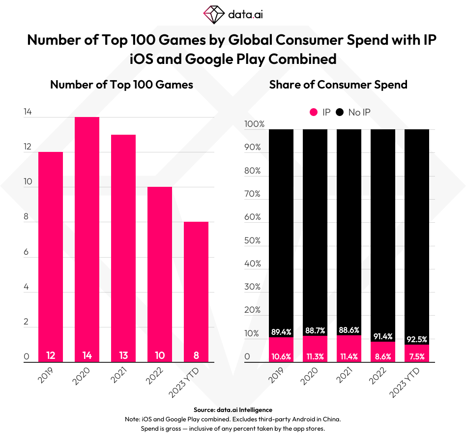 但这个趋势在最近三年有一定下滑,data.ai 预计 2023 年 Top 100 中只有 7 款会基于 IP。