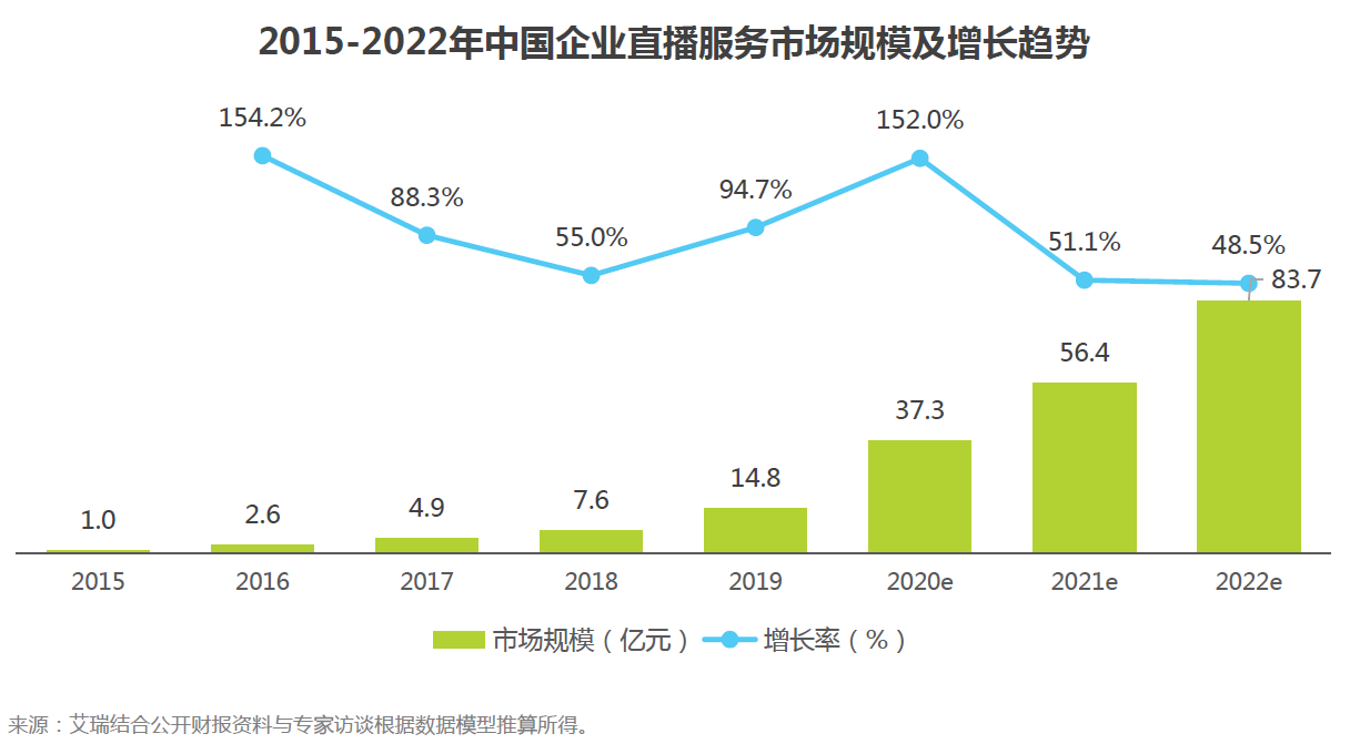 艾瑞咨询认为中国企业直播市场会保持很高的增长速度(平均 ~50% 以上),2020 年收入估计为 37 亿元,到 2022 年可达 83 亿元。